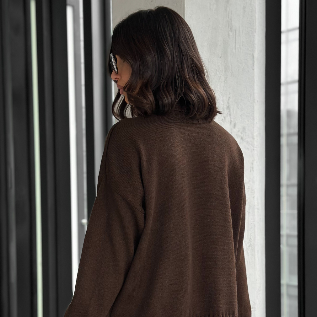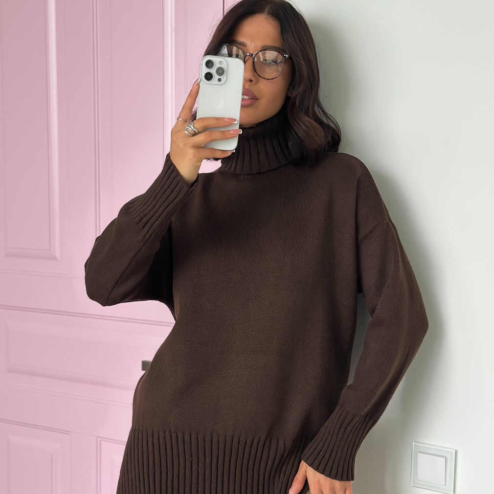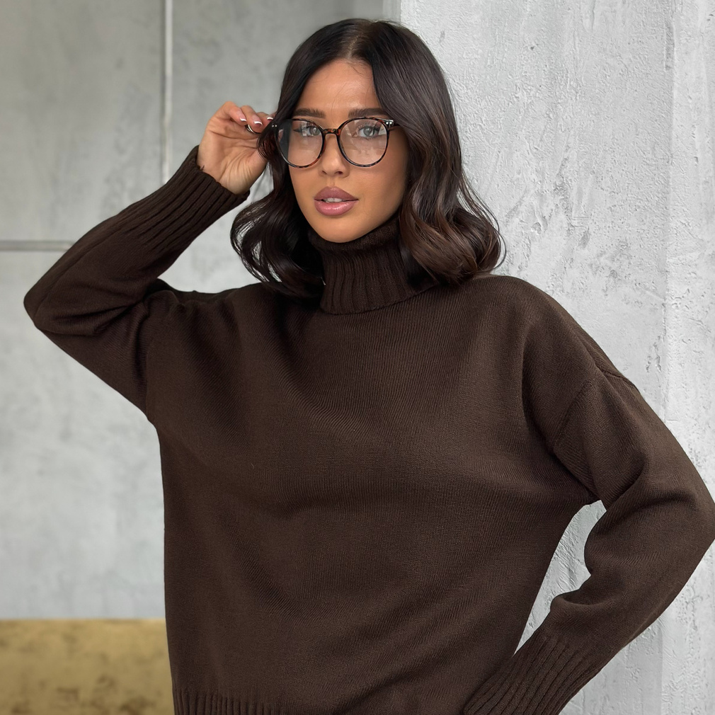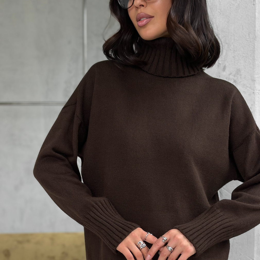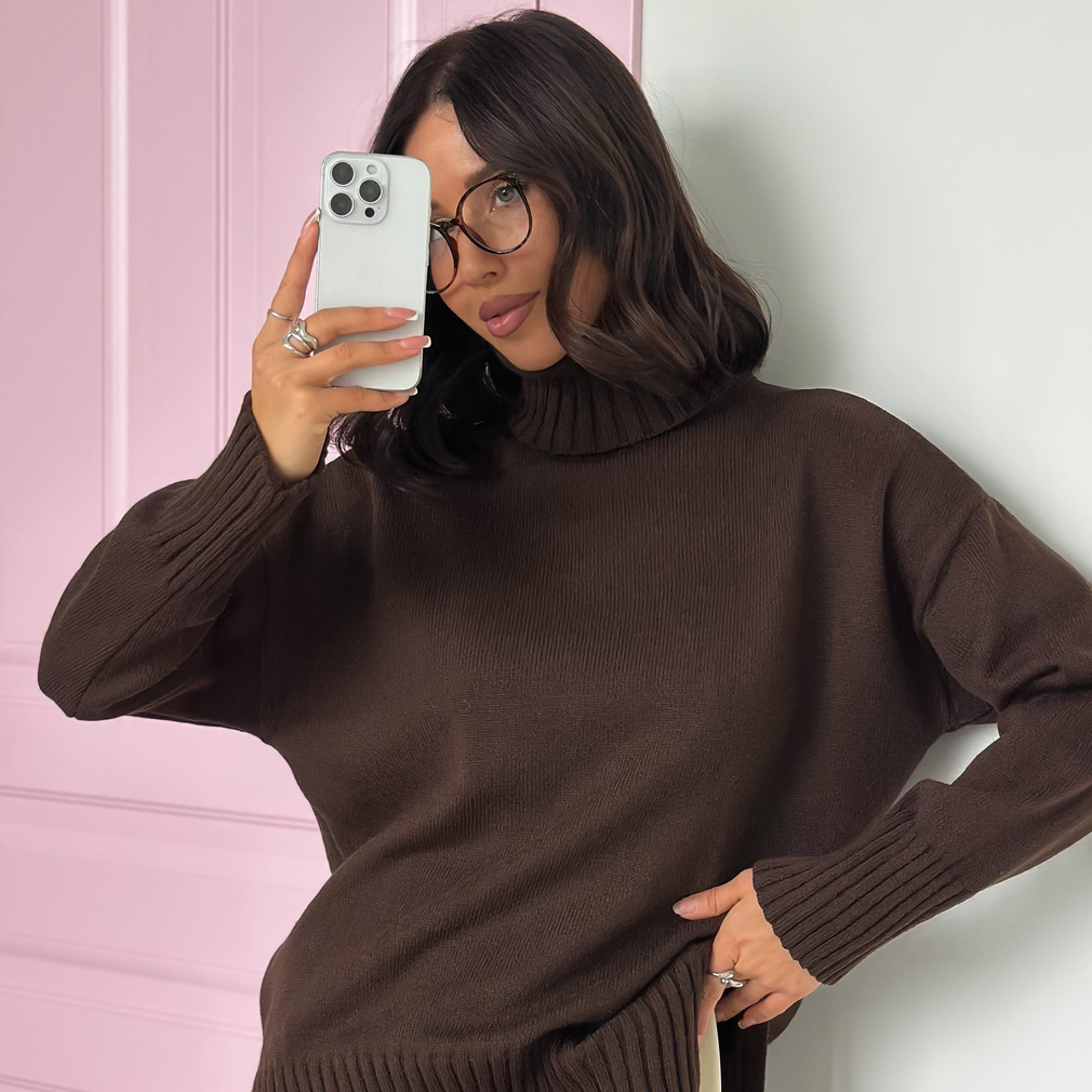 Свитер женский с горлом из шерсти оверсайз коричневый с разрезами внизу