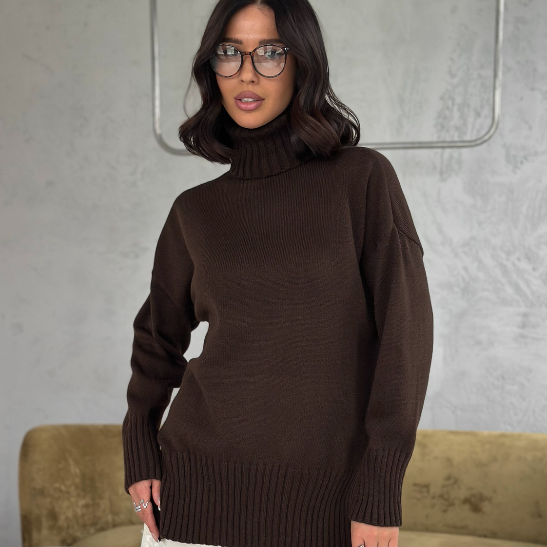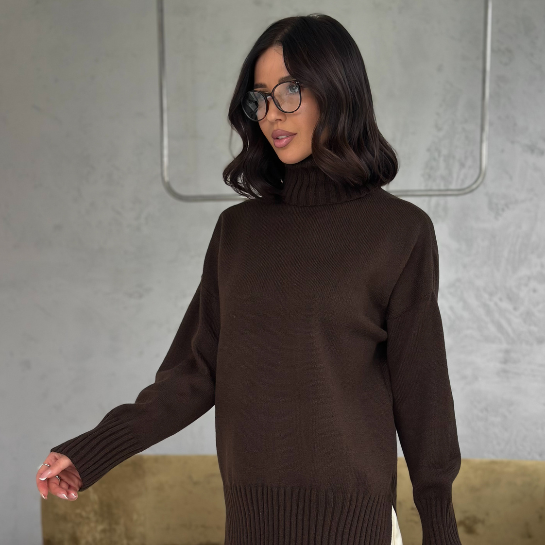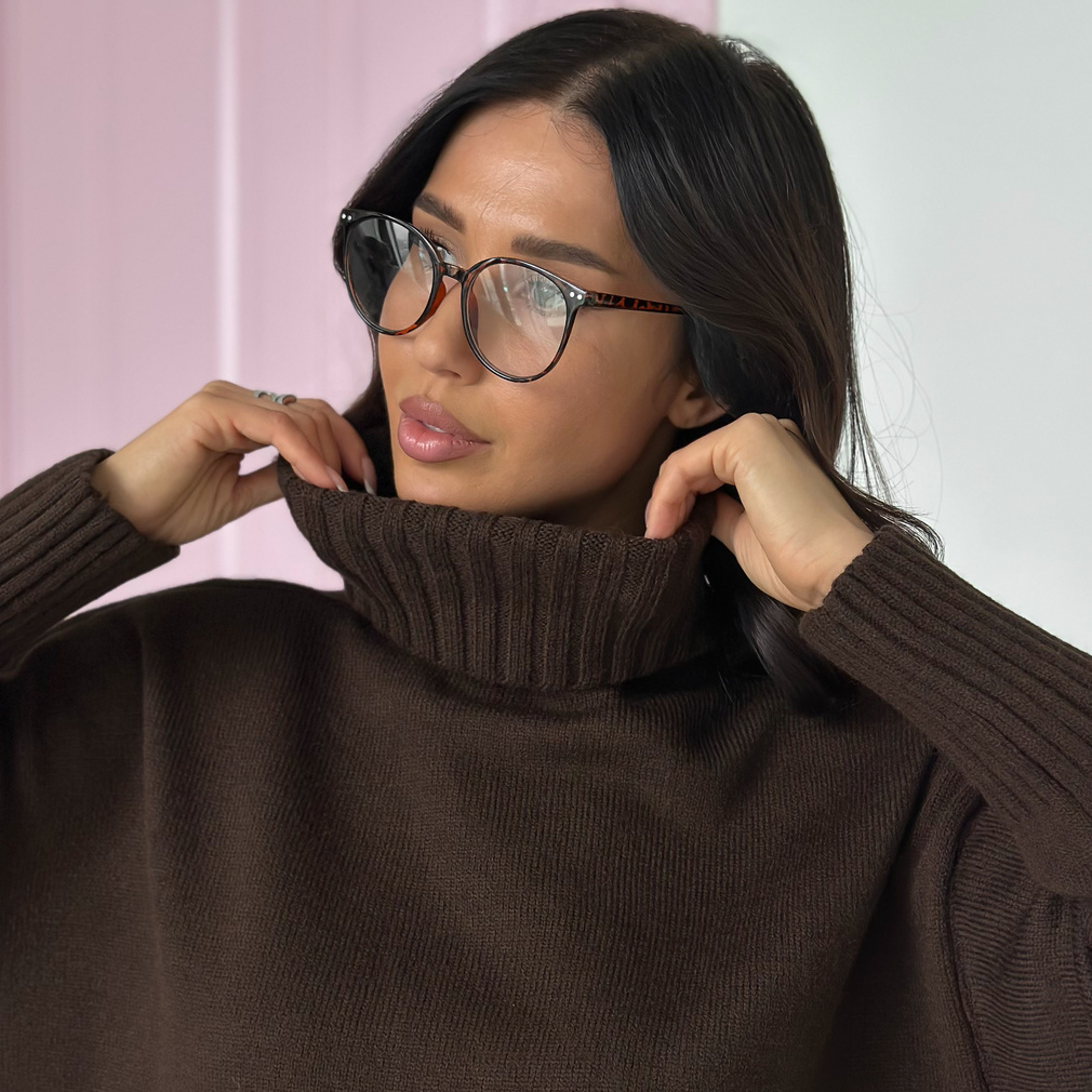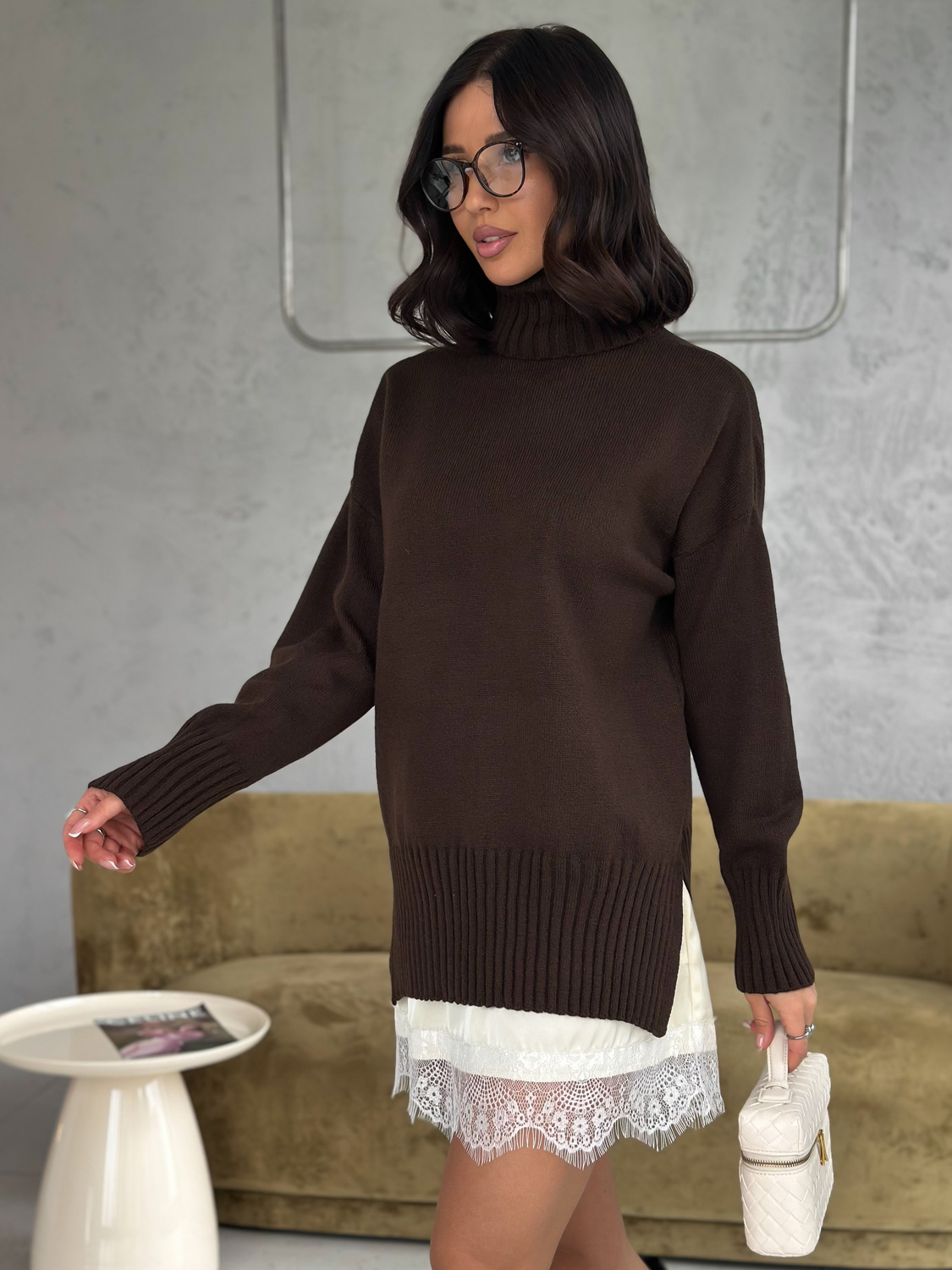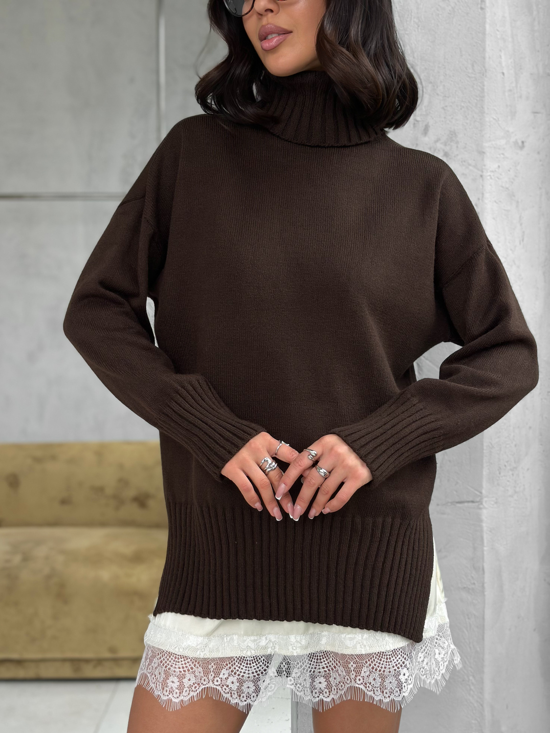 Свитер женский с горлом из шерсти оверсайз коричневый с разрезами внизу