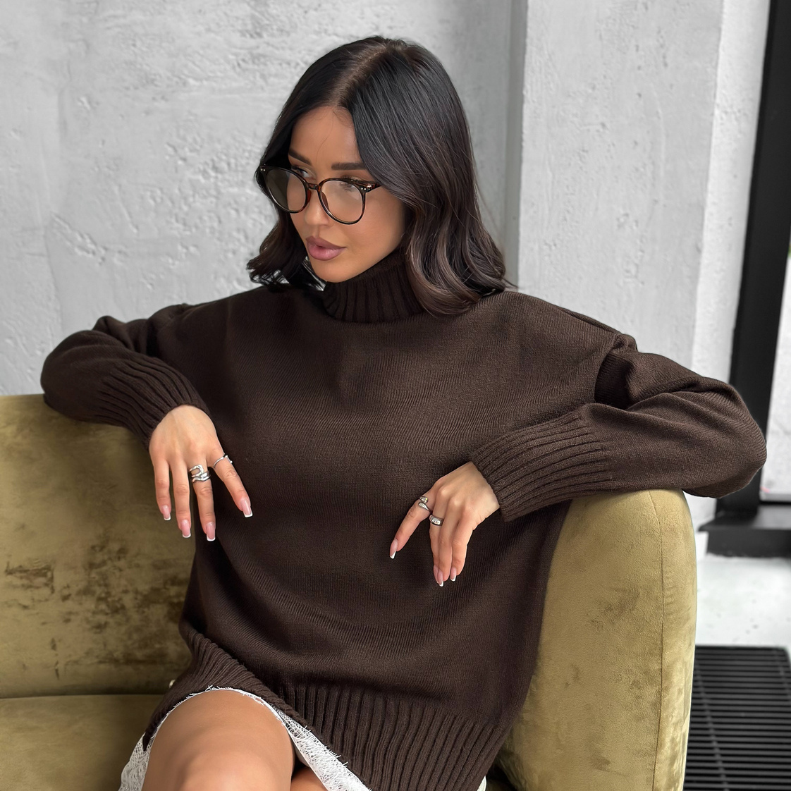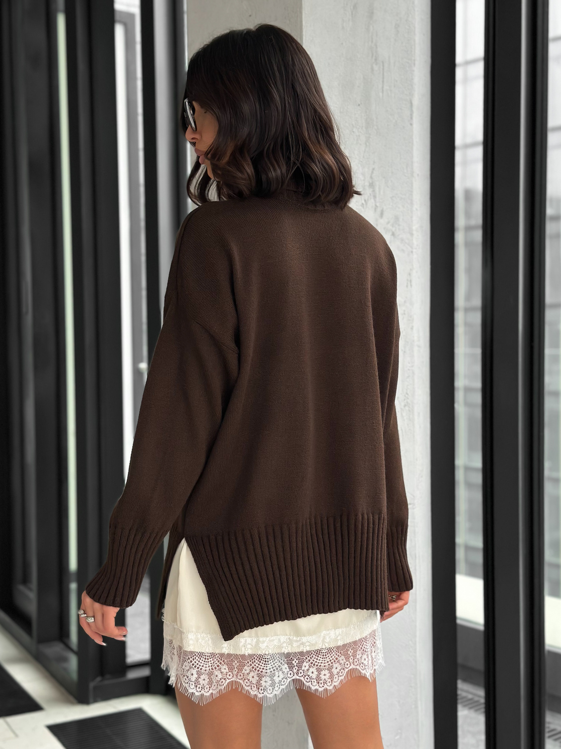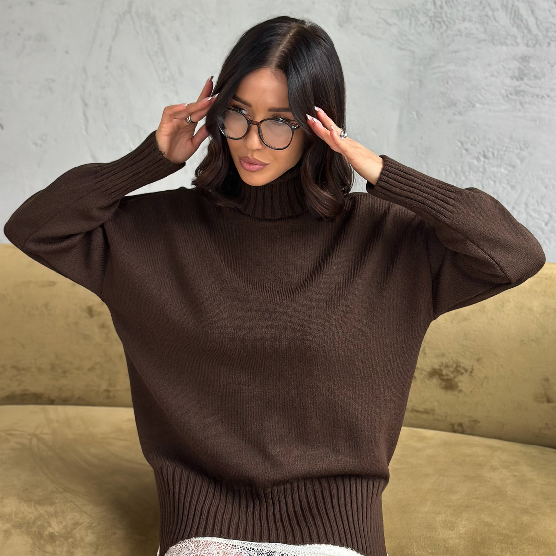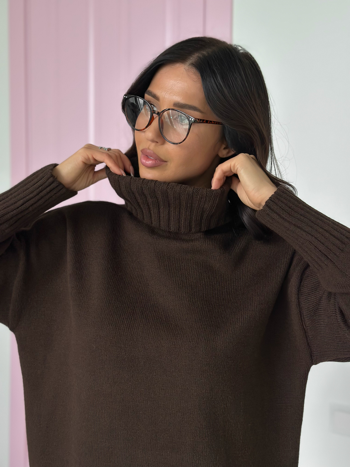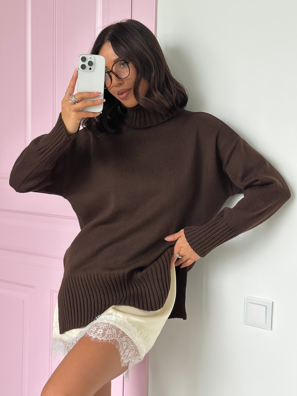 Свитер женский с горлом из шерсти оверсайз коричневый с разрезами внизу